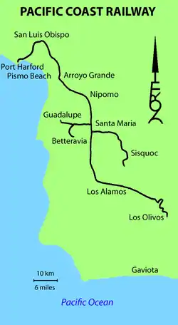 The Pacific Coast Railway was a 3 ft (914 mm) narrow gauge railway on the Central Coast of California. The original 10-mile (16 km) link from San Luis Obispo to Avila Beach and Port Harford was later built southward to Santa Maria and Los Olivos, with branches to Sisquoc and Guadalupe.