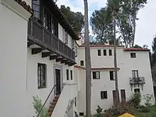 Ince lived in a house overlooking the vast studio, located in what is now the Marquez Knolls neighborhood.[23] Indeed, "Inceville" became a prototype for Hollywood film studios of the future, with a studio head (Ince), producers, directors, production managers, production staff, and writers all working together under one organization and under the supervision of a General Manager, Fred J. Balshofer.[24] On January 16, 1916, a fire broke out at Inceville, the first of many that eventually destroyed all of the buildings. Ince later gave up on the studio and sold it to Hart, who renamed it "Hartville." Three years later, Hart sold the lot to Robertson-Cole Pictures Corporation, which continued filming there until 1922. La Hue writes that "the place was virtually a ghost town when the last remnants of "Inceville" were burned on July 4, 1922, leaving only a "weatherworn old church, which stood sentinel over the charred ruins."