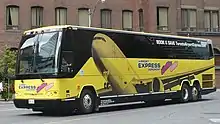 Ebus[3] service started on October 11, 2011 and operates Prevost H3-45 and X3-45 coaches. This subsidiary of Red Arrow travels between Edmonton, Red Deer, Fort McMurray and Calgary in Alberta as well as Kamloops, Kelowna and Vancouver in British Columbia. Service between Edmonton and Kamloops is provided through a partnership with Thompson Valley Charters.