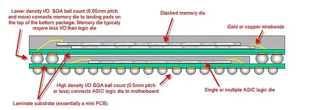 - Mixed logic-memory stacking: logic (CPU) package on the bottom, memory package on top. For example, the bottom could be a system on a chip (SoC) for a mobile phone. The logic package is on the bottom because it needs many more BGA connections to the motherboard.