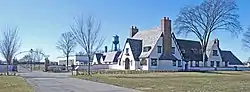 The Packard Proving Grounds consisted of a 2.5-mile (4.0 km) high-speed concrete oval track with timing tower, miles of test roads of various conditions, an airplane hangar (Packard was also involved in developing aircraft engines, and used the track's infield as a landing strip), a repair garage, and a gate house/lodge that housed the Proving Grounds manager and his family. The Tudor Revival lodge building also had garage space for eight cars, plus dormitory rooms for visiting engineers.[2]