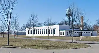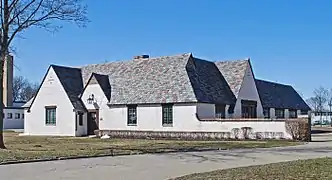 About 100 feet west of the Gate Lodge sits the single story, Tudor Revival style Repair Garage. Designed in 1928 by Albert Kahn, it uses the same wall and roof materials and the same asymmetrical, cross-gabled form as the Gate Lodge. The nearby Engineering Laboratory was designed by William E. Kapp in 1943. It is a 1+1⁄2-story rectangular building, constructed of concrete block with a flat asphalt composite roof. Three smaller outbuildings and a water tower are located north of the engineering building and repair garage. These are the 1927 tool shed, the 1929 garage and restroom, and the c. 1955 electrical building.[2]