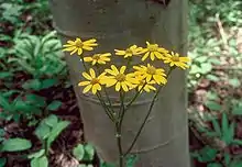 The inflorescence is a loose array of two or more flower heads with yellow disc florets and usually either 8 or 13 yellow ray florets up to a centimeter long each.