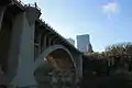 The Paddock Viaduct, also known as the Main Street Viaduct, is a reinforced concrete bridge spanning the Trinity River in Fort Worth, Texas. Low-water crossings and ferries originally provided the only access across the Trinity River at this location, connecting the downtown area of Fort Worth with northern sections of the city. A two-lane suspension bridge, constructed near this site in the 1890s, proved inadequate for the growing population. This span, designed by the St. Louis engineering firm of Brenneke and Fay, was completed in 1914.[1] It was the first reinforced concrete arch in the nation to use self-supporting, reinforcing steel. The bridge is named in honor of B. B. Paddock, former State Legislator and Mayor of the City (1980).