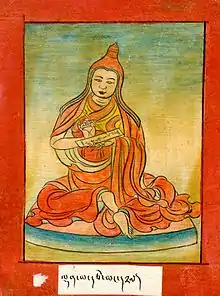 In modern Tibetan Buddhism, Padmasambhava is considered to be a Buddha that was foretold by Buddha Shakyamuni.[2] According to traditional hagiographies, his students include the great female masters Yeshe Tsogyal and Mandarava.[5] The contemporary Nyingma school considers Padmasambhava to be a founding figure.[13][4] The Nyingma school also traditionally holds that its Dzogchen lineage has its origins in Garab Dorje through a direct transmission to Padmasambhava.[14]