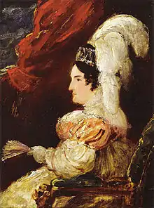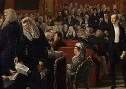 As Princess Lieven observed, the trial was a "solemn farce".[47] On 25 August, a chambermaid from Karlsruhe, Barbara Kress, was sworn in. She was asked about the sheets on the Queen's bed: "Did you at any time see anything on the sheets?", asked the Attorney General. Her response was quietly spoken. Two interpreters, one for the King and one for the Queen, formed a huddle around the witness. The Queen's interpreter claimed the response wuste was not translatable; the King's interpreter was asked to press the witness for a further explanation. The witness broke down, and the proceedings were paused to allow her to regain composure. An eventual translation of "stains" was agreed.[48] Tory Harriet Arbuthnot wrote in her journal "if the Whig Lords do not consider the disgusting details they have heard proof, the Whig ladies may in future consider themselves very secure against divorces."[49]