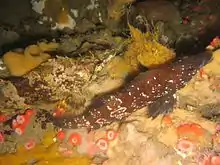 The painted greenling (Oxylebius pictus) is a marine fish native to the northeast Pacific Ocean. Its range is from Kodiak Island, Alaska to central Baja California.[1] It can reach a total size of 25 cm (10 in) and has seven vertical dark bands. It inhabits rocky areas shallower than 50 m (160 ft).[1] Specimens (mainly juveniles) sometimes gain protection from larger predators by living among the tentacles of Cribrinopsis albopunctata or Urticina piscivora sea anemones, which are venomous to other animals but do not harm the painted greenling.[2][3]