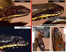 This snake is brown above, with or without darker spots and with a more or less distinct paler dorsolateral band. The lower parts are cherry-red to purplish-black, with a yellow band on each side extending from the lips to the end of the tail. Total length is two feet, and the tail is 5.5 inches.[2]