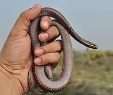 The painted keelback (Xenochrophis cerasogaster) is a species of colubrid snake found in Pakistan, Nepal, Bangladesh, and India (Assam, Uttar Pradesh, West Bengal:- Kolkata). This snake is also called the dark-bellied marsh snake.