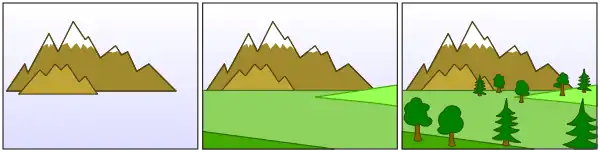 The painter’s algorithm (also depth-sort algorithm and priority fill) is an algorithm for visible surface determination in 3D computer graphics that works on a polygon-by-polygon basis rather than a pixel-by-pixel, row by row, or area by area basis of other Hidden Surface Removal algorithms.[1][2][3] The painter’s algorithm creates images by sorting the polygons within the image by their depth and placing each polygon in order from the farthest to the closest object.[4][5]