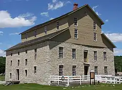 Painter-Bernatz Mill, also known as the Old Stone Mill, is a historic building located in Decorah, Iowa, United States. The original part of the mill was constructed by William Painter in 1851, and it was expanded to its present size in the next year or two. A mill race was constructed from a dam on the Upper Iowa River, and it was routed beneath the building to power the turbine. It was the first of at least 15 mills that used this river as its source of power.[2] The lower two floors are composed of native limestone. The original hip roof was removed sometime between 1874 and 1890 and the present gable roof was built giving the mill a large loft. Diesel power replaced water power in 1947. The building continued to operate as a mill until 1964. It became a part of the Vesterheim Norwegian-American Museum in 1971, and houses exhibits on agriculture and industry. It is also a site in the Silos & Smokestacks National Heritage Area.[3] The former mill is the oldest building in Decorah.[2] It was listed on the National Register of Historic Places in 1974.[1]