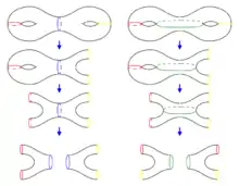 The twist parameters are harder to define. They correspond to how much one turns when gluing two pairs of pants along : this defines them modulo . One can refine the definition (using either analytic continuation[5] or geometric techniques) to obtain twist parameters valued in (roughly, the point is that when one makes a full turn one changes the point in Teichmüller space by precomposing with a Dehn twist around ).