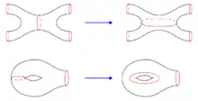 By a recursion argument, this implies that for any surface there is a system of simple closed curves which cut the surface into pairs of pants. This is called a pants decomposition for the surface, and the curves are called the cuffs of the decomposition. This decomposition is not unique, but by quantifying the argument one sees that all pants decompositions of a given surface have the same number of curves, which is exactly the complexity.[1] For connected surfaces a pants decomposition has exactly pants.
