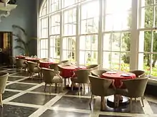Designed by Italian architect Luis Fossatti,[1] and constructed between 1941 and 1946 by the Brazilian entrepreneur Joaquim Rolla,[2] the Palácio Quitandinha is one of the most impressive architectural monuments in Petrópolis. The exterior is in the Norman-French style,[3] while the interior is a mix of Brazilian Baroque and Art Deco.[1] The surface area of the hotel is 50 thousand square meters. It has six floors, with a 10 meter high ground floor. It has 440 rooms plus 13 suites with decor by Dorothy Draper.[4]