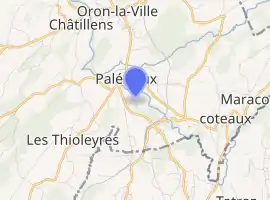Palézieux is located below the confluences of the Broye and the smaller Mionne and Biorde rivers, and has two main settlements: Palézieux-Village and Palézieux-Gare. The Village is situated at an elevation of 634m, and is 1.7 kilometres (1.1 mi) (by road) to the northwest of Palézieux-Gare, which is at 676m. Palézieux-Gare is the smaller settlement but is a notable railway junction, and is named for the railway station there. There is a post office at Palézieux-Gare.[2] The hamlet of Serix, at 660m above sea level, is 1.3 kilometres (0.81 mi) (by road) to the northeast of Palézieux-Village.