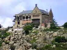 The palace was built between 1920 and 1922 for Abárzuza, Conde de las Almenas III.[1] It is located on the peak of a granite mountain, 1,011 metres above sea level. It covers 100 acres. Parts of it remain carved into the rock, such as stairs and balconies.[2]