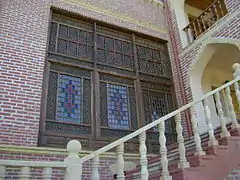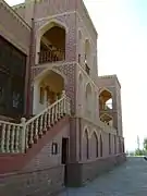 The Khan Palace is built on the western side of the palace complex with a 3600 m² area, facing daylight as khan steep. The Khan Palace complex features a 42 x 8 m building, a newly built swimming pool, water well, green stripes, ornamental and fruit trees. The building is two floors. By the time the palace consisted of two separate sections. The southern section is intended for administrative work and reception of high-class guests, while the northern section is intended for khan's family. Entrance to sections was one of the corridors with two-storeyed balconies. Currently, only southern corridor is used because of the museum's location in the palace. An internal passage was created between the sections. The corridors go above the main façade. The stairs are surrounded by bricks and are fixed with wooden railings.[2]