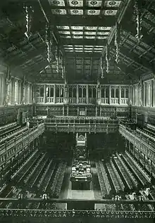 Following the destruction of the Commons Chamber, the Lords offered their own debating chamber for the use of the Commons; for their own sittings, the Queen's Robing Room was converted into a makeshift chamber.[27] The Commons Chamber was rebuilt after the war under the architect Sir Giles Gilbert Scott, in a simplified version of the old chamber's style. The work was undertaken by John Mowlem & Co.,[28] and construction lasted until 1950.[29] The Lords Chamber was then renovated over the ensuing months; the Lords re-occupied it in May 1951.[30]