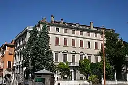 The asymmetrical neoclassical façade appears to split into levels thanks to the use of frames and bands of Istrian stone that connect windowsills, windows, and lintels.[3] Wider windows are set in the left side of the facade. The ground floor is covered with ashlar. The palace extends in depth and has both a central courtyard and a garden.[4]