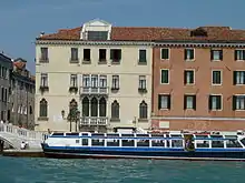 Palazzo Molina or Palace of Two Towers (Palazzo de Due Torri) or Palazzo Navager is a Gothic style palace located on the Riva degli Schiavoni #4145 in the sestiere of Castello, Venice, adjacent to the Ponte del Sepolcro, previously called the Bridge of Ca'Navager. It is best known for being the home, for about five years, of the poet Petrarch.