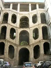 The Palace was erected during 1724 to 1726 by the architect Ferdinando Sanfelice. The entrance portal has two stucco sirens of the Sanfelice family. Through an indistinct façade one enters to an interior octagonal courtyard leads to a double ramp stairwell. The interior frescoes originally by Francesco Solimena are now lost. The staircases with arches in shifting planes still grants an aura of complex scenography, despite its present cramped and dilapidated state: a grandiose entrance leading only to a decrepit palace.[1] The nearby Palazzo dello Spagnolo is attributed to the same architect and has similar staircases.