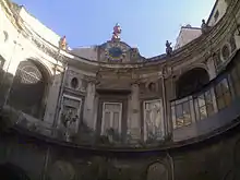 The Palazzo Spinelli di Laurino is a palace, located on the corner of Via Nilo and Via dei Tribunali in central Naples, Italy. A palace at the site was first built in the 15th century, but the present layout, with an elliptical interior courtyard was commissioned by Trojano Spinelli. The courtyard recalls the interior of Palazzo Farnese of Caprarola. The structure is much altered, but still contains in the interior courtyard, a hint of former grandeur with dual ramp staircases, and statuary depicting virtues along rooflines, and a maiolica clock face on a triangular pediment surmounted by a Virgin of the Immaculate Conception.