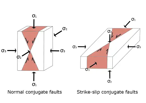 The geometrical properties of conjugate faults are indicative of the sense of stress, but they may not appear in the actual fault patterns.