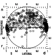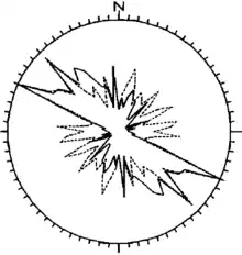 Paleostress inversion refers to the determination of paleostress history from evidence found in rocks, based on the principle that past tectonic stress should have left traces in the rocks.[1] Such relationships have been discovered from field studies for years: qualitative and quantitative analyses of deformation structures are useful for understanding the distribution and transformation of paleostress fields controlled by sequential tectonic events.[2] Deformation ranges from microscopic to regional scale, and from brittle to ductile behaviour, depending on the rheology of the rock, orientation and magnitude of the stress etc. Therefore, detailed observations in outcrops, as well as in thin sections, are important in reconstructing the paleostress trajectories.