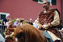 The Palio di Legnano (Italian pronunciation: [ˈpaːljo di leɲˈɲano]; known locally simply as Il Palio) is a folk event generally held on the last Sunday of May in the City Of Legnano, Italy, to recall the Battle of Legnano held on 29 May 1176 by the Lombard League and the Holy Roman Empire of Frederick Barbarossa.[1] This Palio is composed by a medieval pageant and a horse race. Until 2005 the whole event was named Sagra del Carroccio.[2]