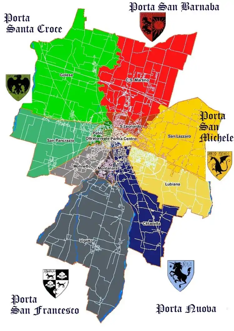 | Dragon | Yellow | Strada della Repubblica, Via Dalmazia, Viale Tanara, Strada Elevata, Viale Partigiani d'Italia, Viale Pier Maria Rossi, Via Zarotto, Via Emilia Est, indicativamente tutta la zona est della città. | Chiesa di San Sepolcro (Parma) (via della Repubblica) |