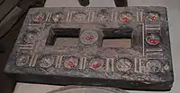 ![]() A typical metal pallanguzhi board with 14 cups and 146 shells. | |