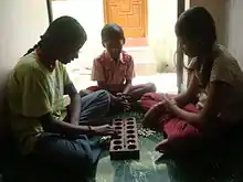 Pallanghuzi, or Pallankuli (பல்லாங்குழி in Tamil,"ಅಳಗುಳಿ ಮನೆ" or Alaguli Mane in Kannada, vamana guntalu in Telugu, പല്ലാങ്കുഴി in Malayalam, "सत्कोलि" or Satkoli in Marathi), is a traditional ancient mancala game played in South India especially Tamil Nadu and Kerala. Later the games were spread to other places including Karnataka and Andhra Pradesh in India as well as, Sri Lanka and Malaysia. Variants are called as Ali guli mane (in Kannada), Vamana guntalu (in Telugu), and Kuzhipara (in Malayalam).[1] The game is played by two players, with a wooden board that has fourteen pits in all (hence the name from the words fourteen pits (pathinaalam kuzhi). There have been several variations in the layout of the pits, one among them being seven pits on each player's side. The pits contain cowry shells, seeds or small pebbles used as counters.[2] There are several variations of the game depending on the number of shells each player starts with.[3]