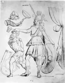 Frothingham posited that Botticelli’s idea for the painting could have come from an image in the Chronography of 354, a Roman calendar by Furius Dionysius Filocalus, the secretary to Pope Damasus I. The calendar depicts the personification of the city of Trier as a female warrior with a spear and shield holding the hair of a male figure with a bow and arrows by his feet. The male is smaller than the female and looks as if he is trying to escape her grasp. The two works are very similar and it is possible Botticelli got his idea for his painting from this image, having seen a copy.[16]