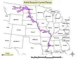 The pallid sturgeon's historical range spanned the entire Missouri River and into the Mississippi River. Historically, the species was rare to nonexistent in the upper Mississippi, probably due to a lack of proper habitat. Currently, the species is considered imperiled throughout its entire range.[30] As of 2008, pallid sturgeon can still be found throughout their original range, but their population numbers have severely declined from the mid-20th century. The Missouri and Mississippi rivers from Montana to Louisiana, as well as the Atchafalaya River in Louisiana, continue to harbor an aging population of pallid sturgeon.[23] Pallid sturgeon have never been very common; as early as 1905 when the species was first identified, they represented only one in five of all sturgeon in the lower Missouri River and as few as one in 500 where the Illinois River meets the Mississippi.[31] Between 1985 and 2000, the ratio of pallid sturgeon to all sturgeon netted declined from one in about 400 to one in nearly 650. A 1996 study concluded that between 6,000 and 21,000 pallid sturgeon remained in their natural habitat at that time.[1]