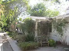 Palmetto Court is a bungalow court located at 100 Palmetto Dr. in Pasadena, California. The court consists of twelve single-family homes arranged along two central pathways with a two-unit building at the end of the paths. A torii-like gate is located at the court's street entrance. Contractor A. C. Parlee built the court in 1915. The homes in the court are designed in the American Craftsman style and feature both shingle and clapboard siding and a variety of roof styles including jerkinhead, gable, and shed.[2]