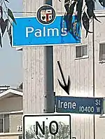 The portion of Palms girded by Overland, Sepulveda, National, and Charnock Road was developed just before World War II as Westside Village. The City of Los Angeles has posted official neighborhood signs for Westside Village, and it has its own neighborhood association: the Westside Village Homeowners Association.[27]