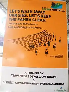 The Kerala High Court has initiated steps to control the pollution of the river from the practice of some visitors to Sabarimala who throw their clothes into it.[3] As part of the Punyam Poonkavanam project, pilgrims have been exhorted to avoid the usage of soap and oil while bathing in River Pamba. They are also requested not to throw any material, including clothes, to this holy river. At a broader level, this project aims to spread the message of cleanliness and greenness beyond Pamba and Sabarimala.[4]