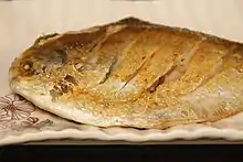 Pomfret is especially popular in Kuwait, and it is one of the most expensive types of fish in the market,[4][5] with the Kuwaiti Pomfret (Gulf Arabic: زبيدي كويتي, romanized: zbēdi kwēti), caught in the waters of Kuwait, being the most sought-after followed by the Iranian Pomfret (Gulf Arabic: زبيدي ايراني, romanized: zbēdi īrāni). The Kuwaiti government regularly bans the fishing of the Kuwaiti type to allow the fish to reproduce.[4] Mtabbag Zbedi (Gulf Arabic: مطبق زبيدي, romanized: mṭabbag zbēdi) is a popular Kuwaiti dish made with fried Pomfret, spices, and rice, with daqqūs, Kuwaiti home-made hot sauce, usually added.