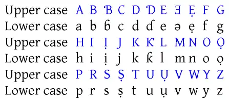 | Lower case | a | b | ɓ | c | d | ɗ | e | ǝ | ẹ | f | g |