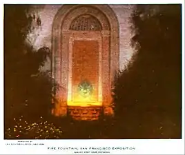 Floodlit pavilion at the Panama–Pacific International Exposition. The Tower of Jewels on the left, and the Italian Tower on the right