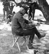 Wide differences in proficiency existed between various guard units in training, leadership and equipment, so that for the most part units came to the border with only basic drilling as experience.[69] Units were initially assigned as static guards for railroad bridges and border crossing points, but as training made them more proficient, they were assigned an increasing responsibility for the patrolling the border that resulted in encounters with smugglers and bandits who still posed an occasional threat. Records of the Utah National Guard indicate that it participated in three skirmishes after it arrived at Camp Stephen J. Little on the Arizona border in July 1916. The final action of the three, occurring January 26, 1917, resulted in an all-day border skirmish between Utah cavalrymen and Mexicans in which the guardsmen were reinforced and ten Mexicans were killed or wounded.[70][n 20] While incapable of conducting organized combat operations with other units, the border security mission proved a training environment for the officers and men of the National Guard, who were again inducted into federal service after the United States declared war on the German Empire in April 1917. Many National Guard leaders in both World Wars traced their first federal service to the Mexican Expedition. In their history of the call-up, Charles Harris and Louis Sadler reveal its significance: