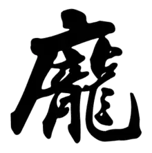 The Pang character, with Long (Chinese: dragon) character in the centre, the two strokes outside is the shape of shrine, illustrating worship of dragon god. As surname, it is generally known as the House of Dragon or Dragon God.
