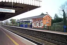 Pangbourne station is mostly served by stopping services run by Great Western Railway between London Paddington and Didcot Parkway. On weekdays, additional services between Reading and Oxford run in the morning and evening peak times. Services run every 30 minutes in each direction Monday to Saturday and hourly on Sundays. Typical journey times are approximately 20 minutes to Didcot Parkway, 35 minutes to Oxford, 10 minutes to Reading, and approximately 1 hour 15 minutes to London Paddington.[3] Most services are run using Class 387 Electrostar trains in 8 coach formation. Due to short platforms, it used to only be possible to unlock the front 7 coaches, however thanks to a platform extension in 2019, all 8 coaches now have full access to the station.