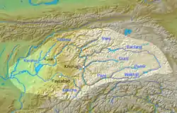 The Panj (Russian: Пяндж; Persian: رودخانه پنج) (/ˈpɑːndʒ/; Tajik: Панҷ, پنج), traditionally known as the Ochus River and also known as Pyandzh or Pyanj (derived from its Russian name "Пяндж"), is a tributary of the Amu Darya. The river is 921 kilometres (572 mi) long and has a basin area of 114,000 square kilometres (44,000 sq mi).[2] It forms a considerable part of the Afghanistan–Tajikistan border.[3]