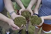 The fragmented volcanic material (pyroclastics) of the tuff ring contains olivine, a silicate mineral containing iron and magnesium, also known as peridot when of gem quality. Olivine is a common mineral component of lava and is one of the first crystals to form as magma cools.[9] Olivine is locally known as "Hawaiian Diamond" and is notably found in Oʻahu's famous Diamond Head landmark.[10] The source of the green coloration of the beach sands is due to the olivine crystals (whose green color is due to ferrous iron) which are winnowed from the eroding headland by the action of the sea. Olivine, being denser than the enclosing ash matrix, tends to accumulate on the beach whereas the less dense volcanic sand is swept out to sea.[11][12] Elsewhere on the Big Island, olivine is enclosed in lava rock, rather than volcanic ash, so the olivine is not easily freed from the enclosing rock and tends to weather away rather than accumulate and concentrate as beach sand.