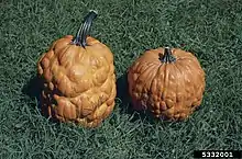 In squash, watermelon and other cucurbits, PRSV-W causes mottling and distortion of leaves and fruit.[12] PRSV-W is considered to be one of the limiting factors in the growing of cucurbits in Florida.[13]