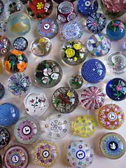 A paperweight is a small solid object heavy enough, when placed on top of papers, to keep them from blowing away in a breeze or from moving under the strokes of a painting brush (as with Japanese calligraphy). While any object, such as a stone, can serve as a paperweight, decorative paperweights of glass are produced, either by individual artisans or factories, usually in limited editions, and are collected as works of fine glass art, some of which are exhibited in museums.[1][2] First produced in about 1845, particularly in France, such decorative paperweights declined in popularity before undergoing a revival in the mid-twentieth century.