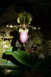 Paphiopedilum glaucophyllum, common name shiny green leaf paphiopedilum or tropical lady's-slipper, is a species of flowering plant in the genus Paphiopedilum of the family Orchidaceae.