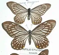 Papilio (Chilasa) epycides, the lesser mime, is a swallowtail butterfly found in India and parts of South-East Asia. The butterfly belongs to the mime (Chilasa) subgenus or the black-bodied swallowtails. It is a mimic of a common Indian Danainae, the glassy tiger butterfly.