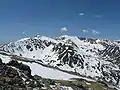 ![]() View of the Parâng Mountains main ridge. The leftmost peak is Găuri while the highest peak (Parângu Mare – 2519m) is visible just to the right of the image center. | |